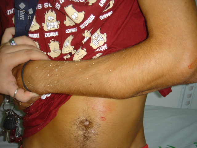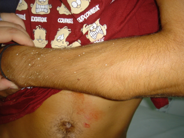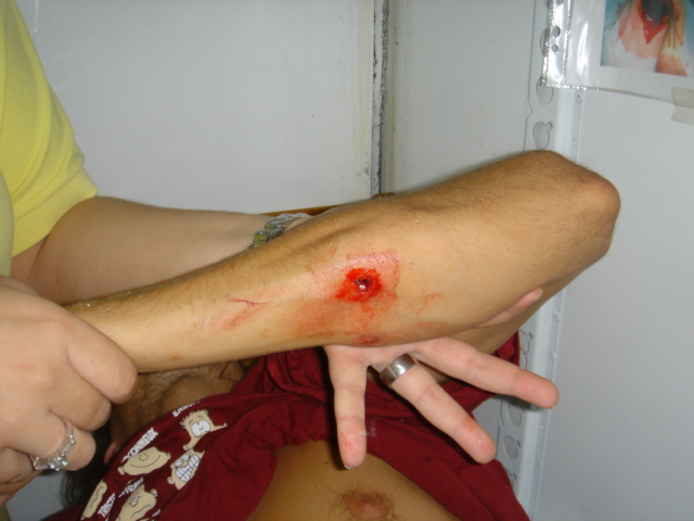 Entra en nuestro quirófano móbil un aficionado que trae un brazo sujetando el otro. La facies es de dolor extremo.Está lívido y mareado. Esta es una de las patologías mas frecuentes en medicina taurina (y en trauma en general) junto a otras como la fratura y luxación de clavícula, la fractura de Colles, las cornadas cerradas, heridas y esoriaciones, esguinces de tobillo, etc. En este caso nuestro paciente portaba una herida en el antebrazo posterior izquierdo causada por una fractura doble de cúbito y radio que no nescesitó Rx para el diagnóstico porque hablaba por si sola. Se ve claramente la desviación total del antebrazo de su eje central. Se estabilizó el paciente. Se le aplicó inmovilización con vendaje de velpeau. Se aplicó crio terapia y se procedió a su traslado para el tratamiento y estudio definitivos. |