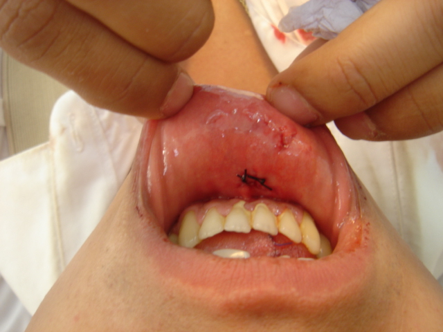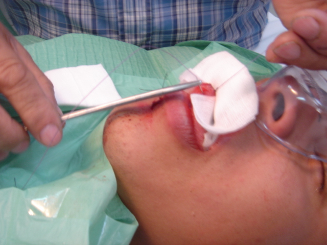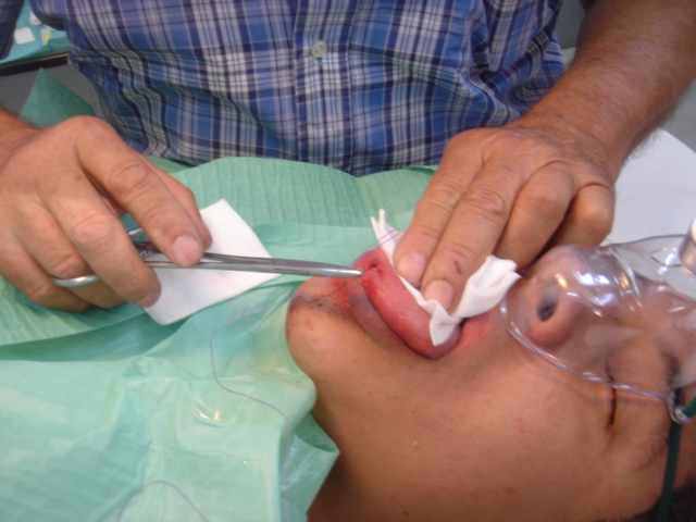 17 de Septiembre de 2006 Norvic García La lesión que presenta este banderillero no es muy frecuente pero es una herida por asta de toro que a la postre no se sabe con certeza el mecanismo etiológico de la misma. Es una herida producida por el asta que lesiona con su punta la zona del mentón atravesándola por completo pero a menudo existen lesiones concomitantes como en este caso que se produce una herida estrellada en la lengua que solo podemos presumir que son las arcadas dentarias las que la producen. El paciente se interviene en la enfermería de la plaza tras un período de agitación nerviosa. Sutura de ambos lados de la herida por asta de toro; por tanto es una herida en sedal. Y sutura de herida estrellada de lengua. Parte de asistencia. |
