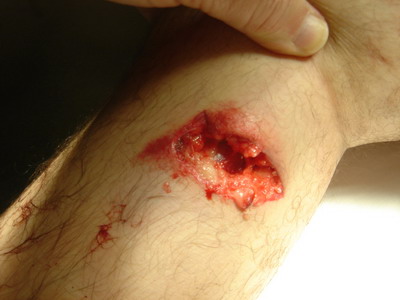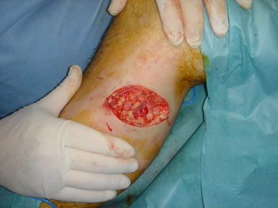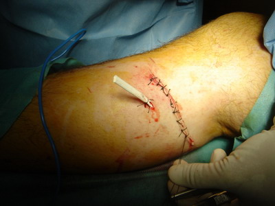 Recibimos este paciente que en capea sufre la embestida de un añojo que casi sin cornamenta le produce una cogida y cornada superficial. Herida en tercio superior cara posterior de pierna dcha. Que interesa planos superficiales, fascia muscular y tejido muscular de gemelo interno. En el hospital exploramos digitalmente la herida y decidimos exploración y reparación de las lesiones en quirófano. Herida única que al ser inferida por un cuerno de pequeñas dimensiones no produce trayectorias definidas sino lesión en forma de campana En el miembro contra lateral se observa un gran varetazo que corre todo el muslo. Se interviene con la técnica acostumbrada: -Exploración digital e instrumental de la herida preparada aséptica y rasurada. -Ligadura y extirpación de elementos vasculares -Extirpación de bordes desvitalizados de herida mediante Friederich conservador. -Lavado profuso de las lesiones a chorro con solucion de h2o2 y suero fisiológico arrastrando las impurezas que se hayan introducido por esta puerta de entrada. Se observará la hemostasia que produce el h2o2 y el color rosa claro que da a los tejidos. -Extirpación de restos de tejidos desvitalizados y destrozos sobrantes como acúmulos lipoideos. -Reestructuración de los planos anatómicos afectados. -Drenajes efectivos de las cavidades resultantes. -Cierre por planos. Detalles gráficos. Cornada aficionado 1 Cornada aficionado 2 En quirófano 3 Exploración 4 Drenaje 5 |