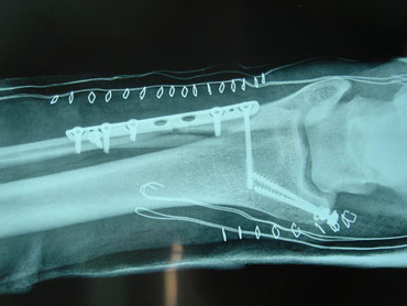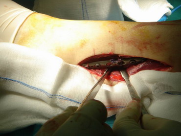 14 - 5 - 07 El torero se interviene hoy a la 12,30 horas en la Clínica Sagrado Corazón de Sevilla. Se confirma diagnóstico provisional hecho en la enfermería de la plaza de Osuna. Fractura de tibia y peroné. Con las siguientes connotaciones: La fractura de peroné es completa y compleja consta de 4 fragmentos diferentes con desplazamiento de los mismos. es decir una fractura conminuta. La tibia presenta fractura maleolar con desplazamiento y además con respecto al tobillo existe una subluxación de la articulación debida a la rotura o explosión de la cápsula articular con desflecamiento de la misma. En resumen un cuadro complejo de tobillo inestable que precisa intervención quirúrgica inmediata. Se estabilizan las fracturas, se sutura la cápsula anterior, se reduce la subuxación, se administran factores de crecimiento y se inmoviliza extremidad. Pronóstico grave. Se estima un tiempo de recuperación de 90 días. Dr. Minguet. Dr. Periañez. Dr. Vaz. Dr. Morales |
