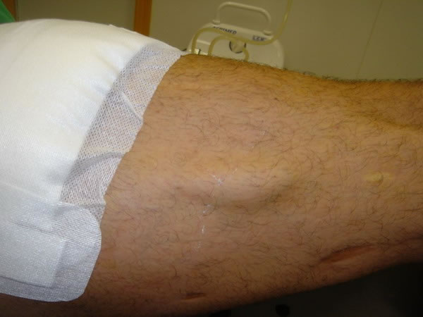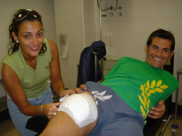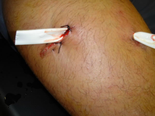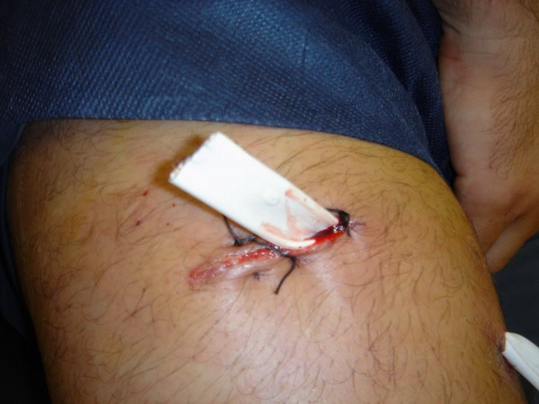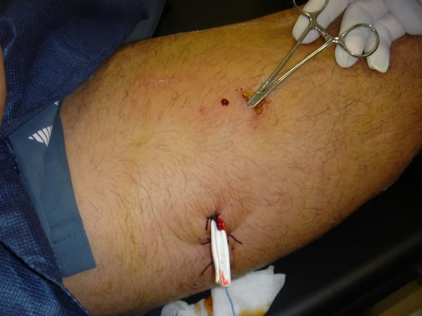 Agosto 2 de 2007 Cornada en Sedal. Toreando en las cercanías de Jerez en la Finca Tesorito sufre la cogida de una vaca cuatreña. Le infiere una cornada en sedal al darle un pase de pecho con la diestra Una cornada de este tipo es aquella en la que asta del animal entra y sale ocasionando dos orificios.en lugar del orificio único habitual. En este caso provoca una trayectoria de 15 cm. transversal al eje del muslo derecho y otra de 8 - 10 cm. de trayectoria ascendente que exploramos en la cura que practicamos al diestro. No disponemos del parte de quirófano del Hospital de Jerez y según manifiesta el paciente solo estarán afectados la capa cutanea y el tejido celular subcutáneo. No podemos explorar la herida en profundidad por razones obvias; por lo que procedemos a la cura correspondiente con exploración parcial. La herida y el drenaje de Penrrose, que como vemos en la imagen tiene vista por ambos extremos, tienen buen aspecto. El torero no presenta fiebre ni dolor excesivo, aunque sí, molestias a la deambulación. Los apósitos muestran el exudado supurativo típico del segundo día tras la cornada. Debe permanecer en reposo, mantener curas diarias y continuar el tratamiento con Augmentine y voltarén comp. Se inicia la retirada del drenaje. Próxima revisión y cura en 24 horas. Pronóstico Reservado. |