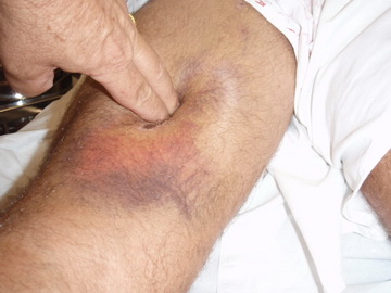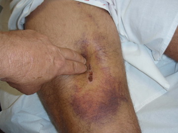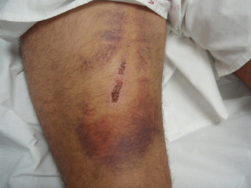 Presenta importante hematoma circundante a zona clara en cuyo centro se dibuja la escara de varetazo corrido que quiso llegar a herida abierta pero se quedó en elongación cutánea forzada hacia el interior del muslo.