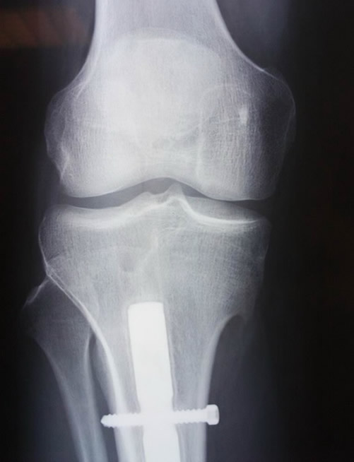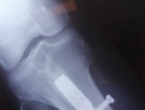 Le realizamos estudio Rx no hallando daño aparente en el mismo. Se puede ver parte del clavo de titanio que le implantamos en la tibia a principio de la temporada 2008. |