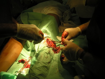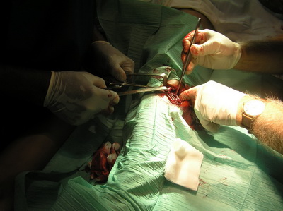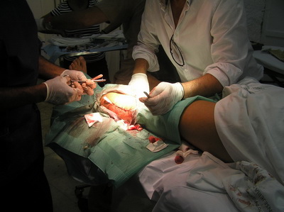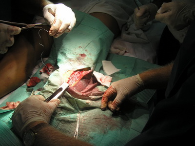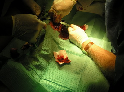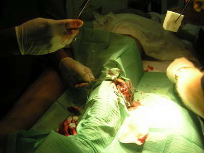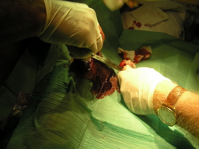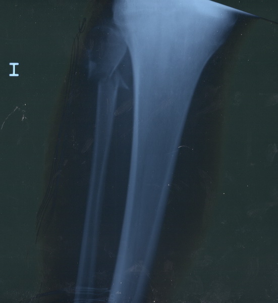 Al llegar al hospital de Riotinto, se le practica exploración y estudio radiológico, se confirma nuestro diagnóstico. Al no haber desalineación de fragmentos óseos, se proceden a inmovilizar la extremidad con férula posterior para tener acceso a la herida, poder realizar curas locales y retirada paulatina de drenaje. |