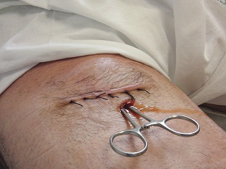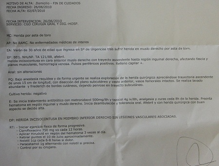26/06/2010 Ciudad Real Antonio Osuna Grave cornada en raíz de muslo dcho. que penetrando desde tercio superior del mismo, llega a ingle derecha. Respeta vasos femorales y afecta a tejido subcutáneo, fascia muscular y músculo recto anterior. Trayectoria hacia arriba y afuera de aproximadamente 15 cm. de longitud con profusa hemorragia venosa Se atiende en Uvi donde permanece cerca de una hora en ambiente de alta temperatura, tras lo cual es trasladado a Hospital cercano. (Según paciente) donde es intervenido quirúrgicamente y permanece hospitalizado hasta el 2/07/2010. Dada la gravedad del paciente la familia entra en contacto con nuestra consulta a raíz de la cornada. El día 3/07/10 lo atendemos en consulta y continuamos la evolución de las lesiones. La herida al principio es muy productiva (exudado) de liquido seroso agua-sangre. Zona de abultamiento en trayecto de cornada. Muy adolorido. Afebril. Se realizan curas diarias con avivamiento de orificio de drenaje el primer día para asegurarnos de la permeabilidad de la herida y ausencia de absceso en trayecto. Se realizan rx de muslo y cultivo de exudado. Tratamiento antibiótico, anti inflamatorio.