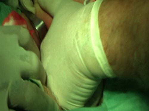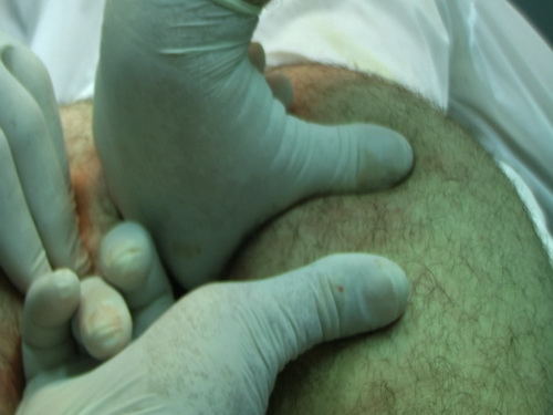 Presenta herida por asta de toro en zona yuxta anal superior izquierda. Cornada peri anal.