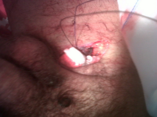 Realizamos anestesia local en zona y procedemos a ampliar la herida de la raiz del muslo para el abordaje de los vasos sangrantes.