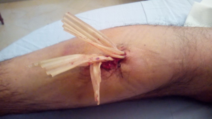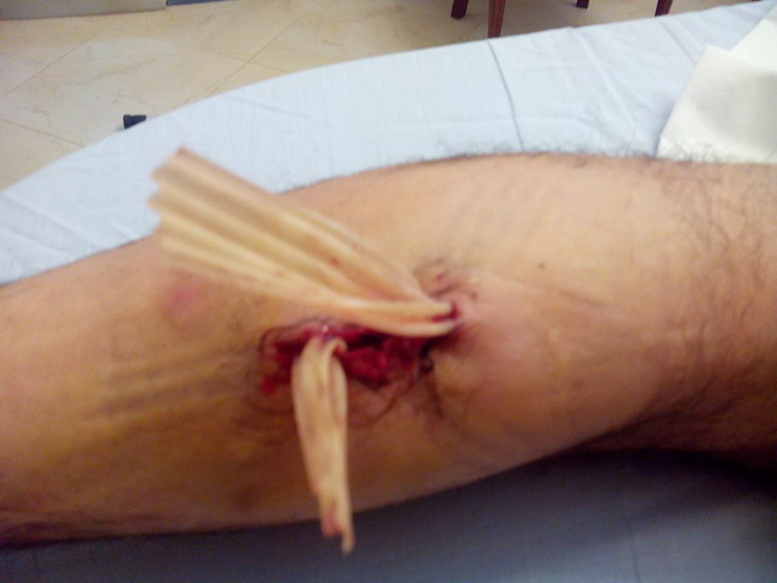 Esta mañana se procede a cura en domicilio de paciente. Buen estado general. Aspecto de extremidad herida sin novedad. Afebril. Sin molestias. Sin dolor. Aspecto de la herida bueno. Exudado, el correspondiente al tiempo transcurrido. No inflamación. No edemas. No crepitación. Pulsos pedios conservados. Buen color de zona aunque hipotermia distal pie izquierdo. Se revisa herida. Se extraen parcialmente los drenajes de las tres trayectorias y se realiza vendaje semicompresivo. Procede continuar reposo relativo. Continuar tratamiento igual. Cura local mañana y posible extración de drenajes. Fdo. Dr. Morales Maruri. Trigueros 15/09/2014 |
