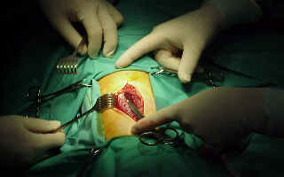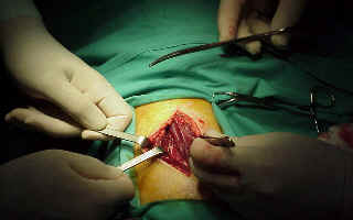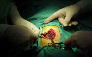 Entre nuestros dedos la longitud del desgarro muscular antes de proceder a poner los drenajes por contra abertura.