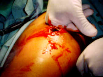 Orificio de entrada localizado en tercio medio, cara antero-interna de muslo izquierdo con trayectoria ascendente de treinta cm. de longitud que contunde y diseca la arteria femoral, que ocasiona hematoma venoso que se extrae; y produce afectación y desgarro de músculos Vasto interno, Sartorio y Recto anterior.