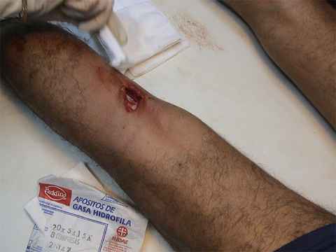 Durante el festejo celebrado el día jueves, 19 de septiembre de 2002 , en la localidad de LA algaba, es asistido en esta enfermería D. MANUEL JESÚS GALLARDO MORENO, por haber sufrido CORNADA EN HUECO POPLÍTEO CON TRAYECTORIA ÚNICA DE APROXIMADAMENTE 10 cm DE LONGITUD QUE AFECTA PLANOS SUPERFICIALES Y MUSCULARES DESGARRANDO ZONA SUPERIOR DE PAQUETE GEMELAR durante el tercio de SUELTA DE VAQUILLAS, de la lidia del toro.