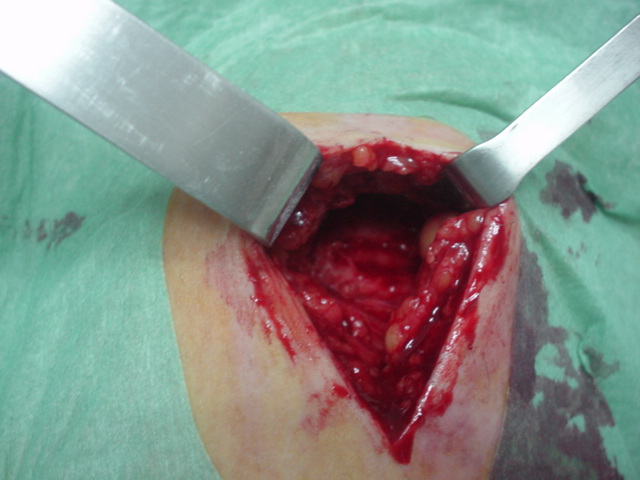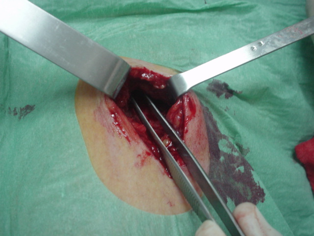 Bajo anestesia, se incide en la zona de la cornada, y se realiza exploración de la misma que muestra trayectoria subcutánea de aproximadamente 10 cm de longitud, en dirección ascendente. No afectación de aponeurosis ni masa muscular, afectando exclusivamente a tejido celular subcutáneo.
