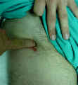 La espacio indurado es prominente y eleva todas las estructuras, perdiéndose el pliegue natural de la ingle. Dicho espacio se encuentra por encima del sello del pitón ( hacia donde se dirige el pitón despues de envainar la piel )