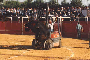 Los mulilleros son los personas que con el tiro de mulas (también se suelen usar caballos fuertes) retiran a los toros hasta el desolladero. Aunque también, como muestra la foto, en las plazas portátiles o de tercera categoría, utilizan maquinaria pesada. Esto si que es una fea imagen dentro del espectáculo taurino.