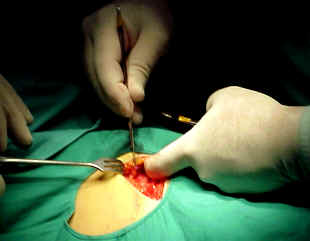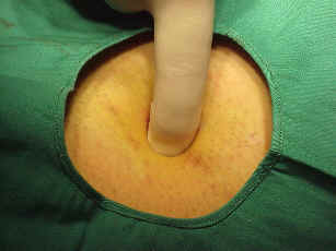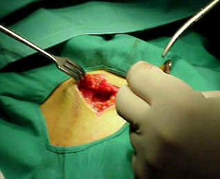 encontramos, que efectivamente había hiato en fascia que se ve claramente en imágen en punto adyacente a inicio de varetazo ( que se adivina en borde izq. de herida operatoria, hacia abajo) y que por lo tanto corresponde al punto de encuentro de pitón-piel