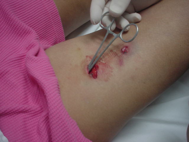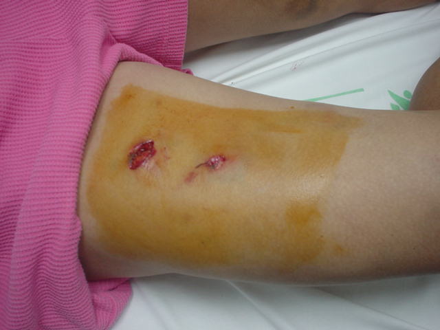 En principio esta imagen nos debe sugerir una cornada pequeña en sedal; con agujero de entrada abierto y posible agujero incompleto de salida inferior. No era este el caso. Se trató de dos cogidas diferentes en momentos diferentes y a escasos cms. la una de la otra De hecho la trayectoria de la herida siguió sentido contrario, ascendente.