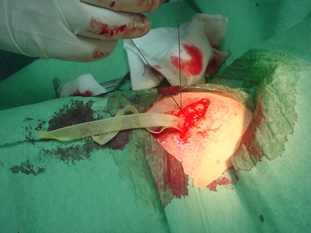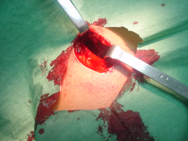 Detalle del interior de la herida que penetra hasta tejido muscular comprometiendo la fascia muscular y dislacerando la musculatura del recto anterior.