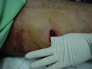 Tras la exploración, se le diagnostica : Herida por asta de toro; con entrada en tercio medio, cara interna del muslo izquierdo que presenta tres trayectorias que interesan planos cutáneos y subcutáneos superficiales, desgarramiento aponeurótico transversal con hojal en dirección a fémur de 6-7 cm. , con sección y dislaceración del músculo vasto interno y disección, en profundidad, de la arteria femoral.