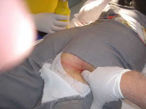 Tratamiento: Limpieza y desinfección de la herida erosiva glútea. Crioterapia. Anti inflamatorio tópico en rodilla D.