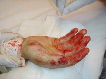 Octavio Pérez Vito Ingresa en enfermería por herida producida en el transcurso de la lidia. encontramos: Herida en cara Palmar de mano dcha y dedo medio de dicha mano.Se sutura en enfermería de plaza de toros. Pronóstico reservado Firman el parte los Drs. Arenas Alcalá y Morales M. |