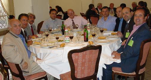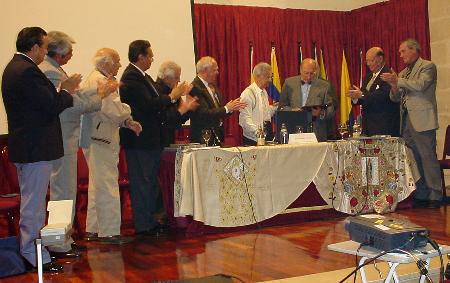 En la foto participantes de la delegación Española con D. Ramón Vila y D. Benjamín Muñoz de Morelia Méjico. Trabajos científicos de honda enjundia cautivaron a los profesionales asistentes que llenaban los salones de conferencias y Mesas redondas. como: * Últimos avances en Cirugía Digestiva aplicados a la Cirugía Taurina. * La Cirugía Taurina en el Segundo Milenio. * Infecciones producidas por asta de toro. Bases para su tratamiento. Homenaje mediante placa, al miembro fundador, padre de la criatura y presidente honorario de nuestra Sociedad, Dr. Javier Campos Licastro, Delegación Mejicana. El Foro en pleno ovaciona al Maestro; al igual que todos los Presidentes de Capítulos Nacionales. Dr. D. Virgilio Olano (Colombia) Dr. D. Humberto Olague ( Méjico) Dr. D. Tulio Carnevali ( Venezuela) Dr. D. Andrés León (Perú ) Dr. D. Guillermo Acosta ( Ecuador) Dr. D. Julio Mendoza ( España ) Dr. D. Javier Campos Licastro ( Méjico ) Dr. D. Jorge Olsina ( España ) Dr. D. Enrique Ruiz ( España) Dr. D. Jean Pierre Scheneider (Francia ) |